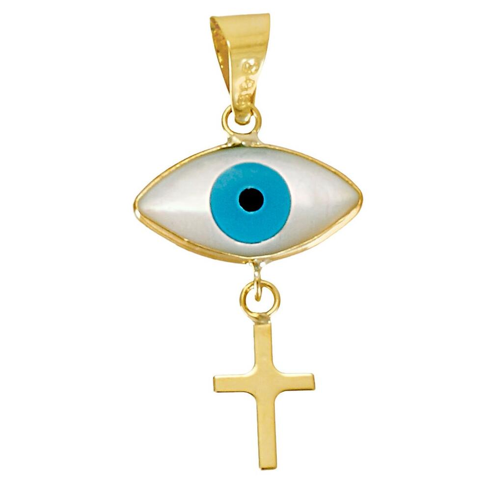 Ματάκι σχέδιο ματιού,με κρεμαστό σταυρουδάκι,πέτρα φίλντισι, κατασκευάζεται σε Κίτρινο χρυσό και Κ9, Κ14, Κ18