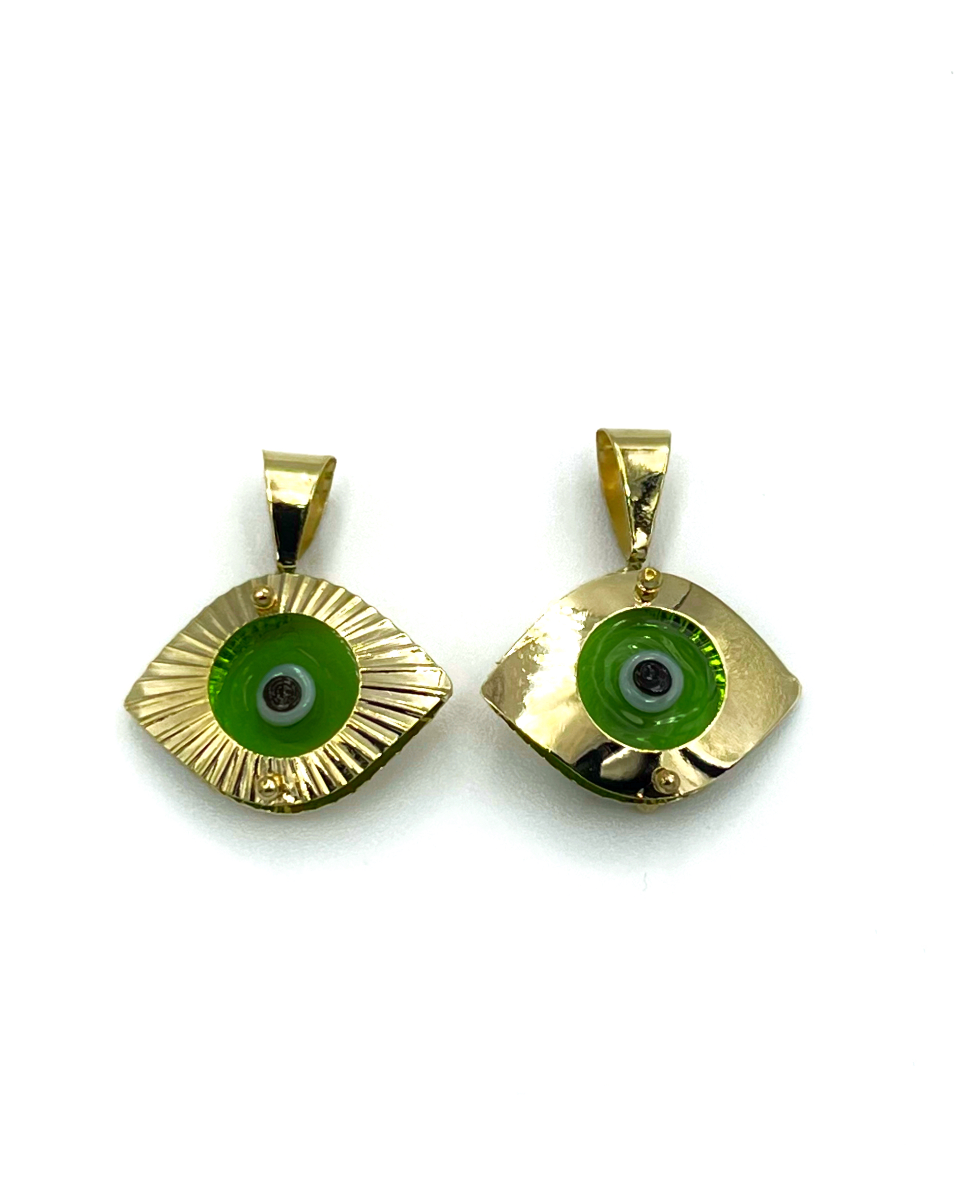 Μεταγιον διπλής οψεως σχέδιο ματιου με γυάλινη πέτρα μάτι (χρωμα πρασινο) κατασκευάζεται σε κίτρινο και λευκό χρυσό και Κ9,Κ14,Κ18
