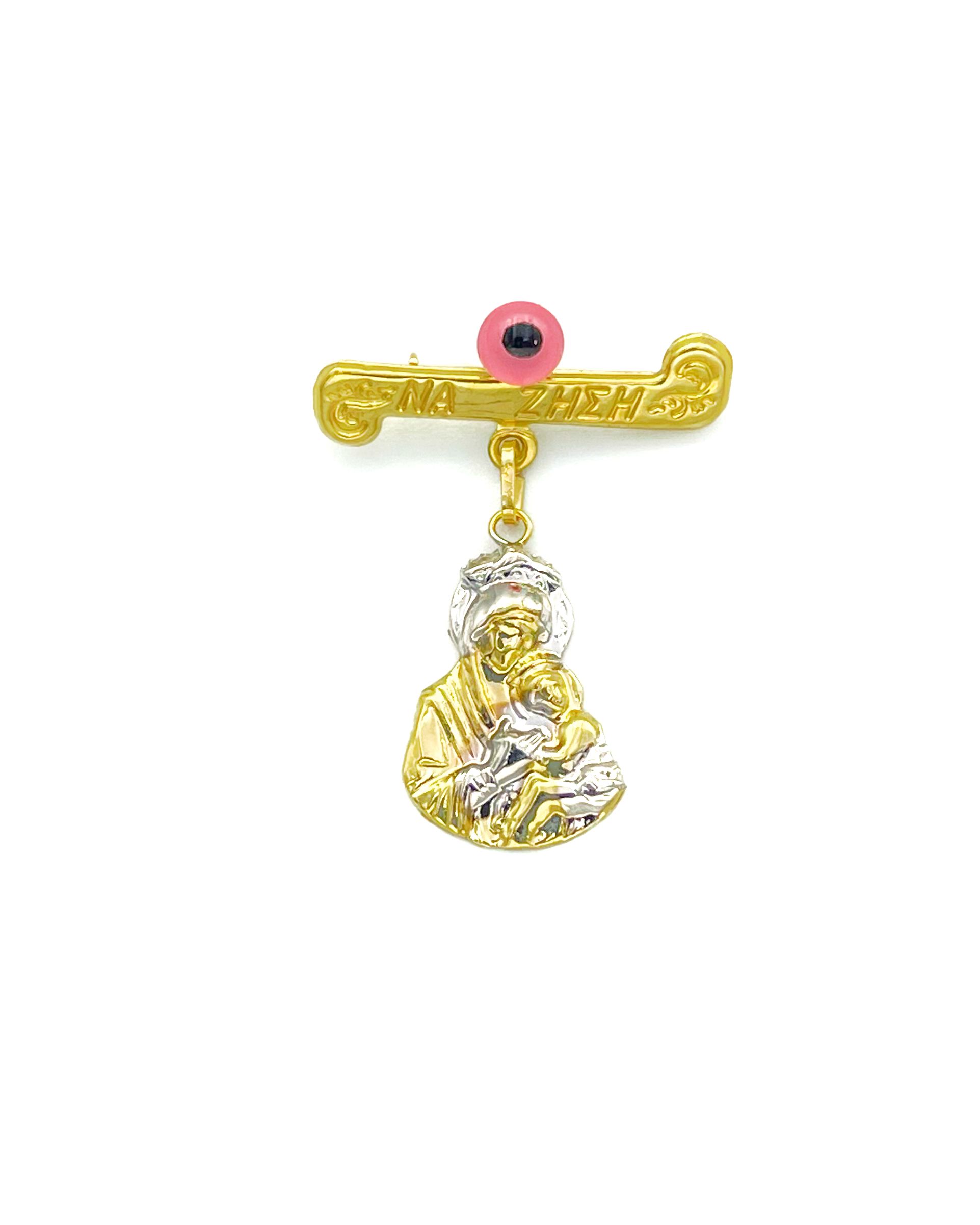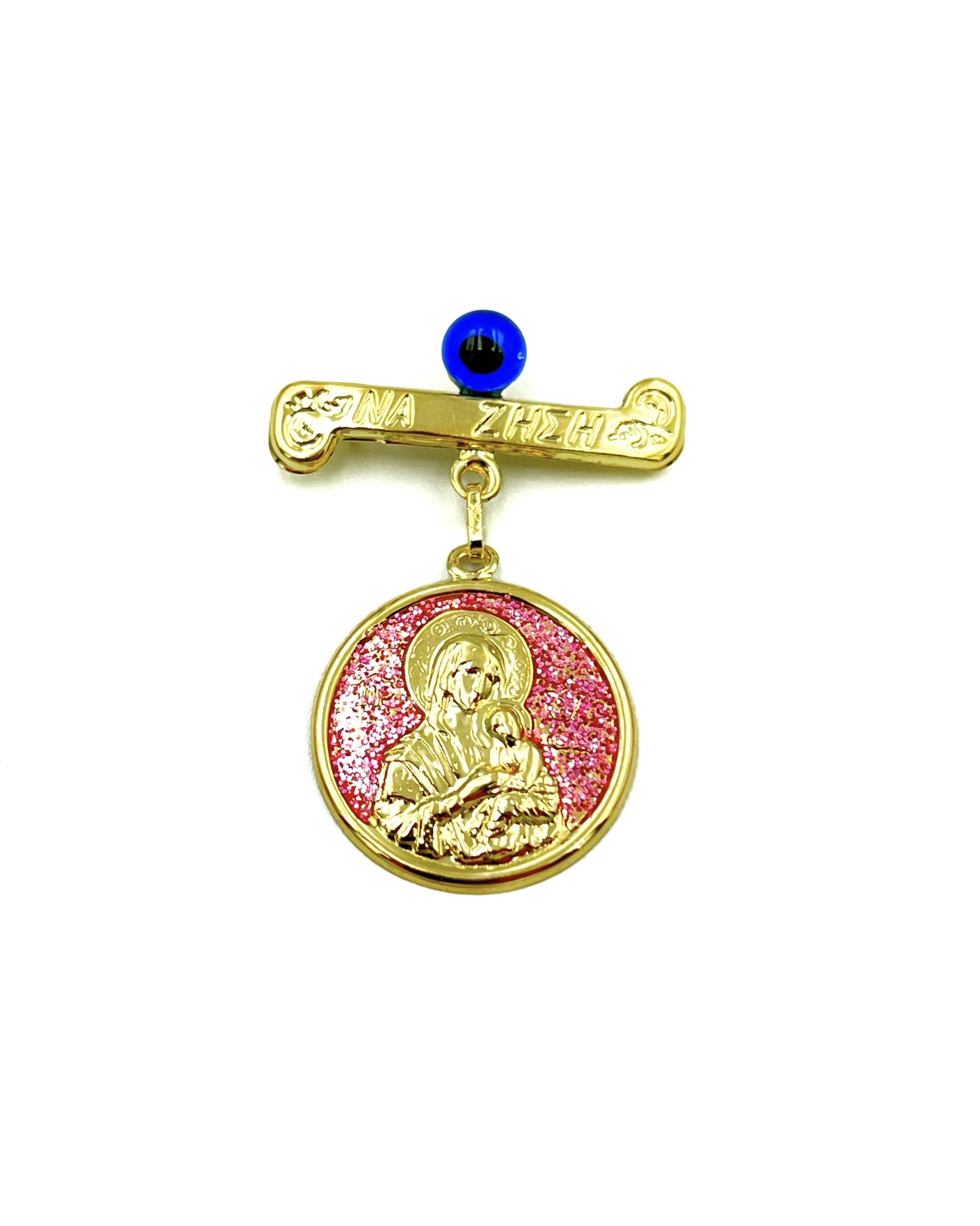 Φυλαχτό Παναγία με παραμάνα, πέτρα γυαλί χρώμα ροζ