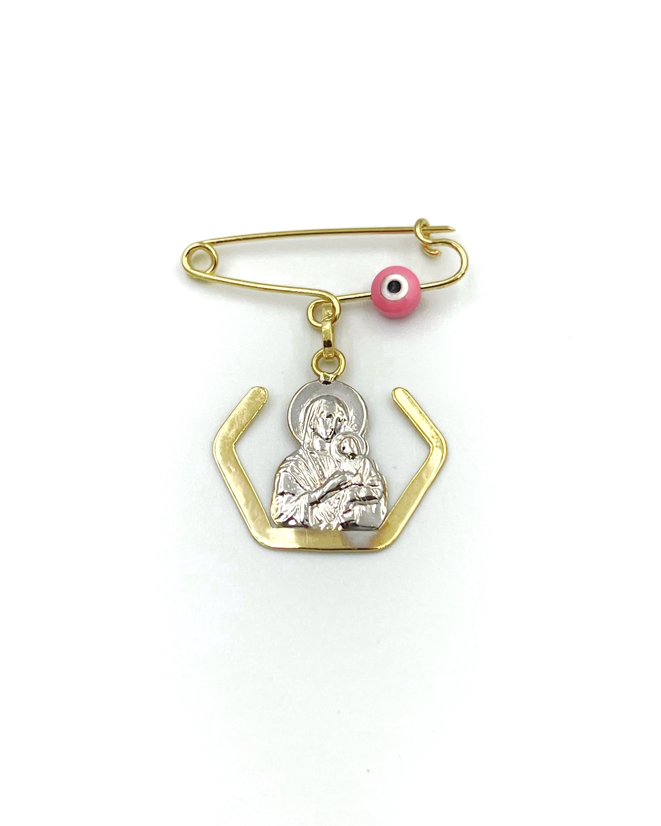 Φυλακτό Παναγία με παραμάνα σύρματινη και ματάκι (χρώμα ροζ) βάρος περίπου 1,00γρ κατασκευάζεται σε δίχρωμο χρυσό και Κ9, Κ14, Κ18