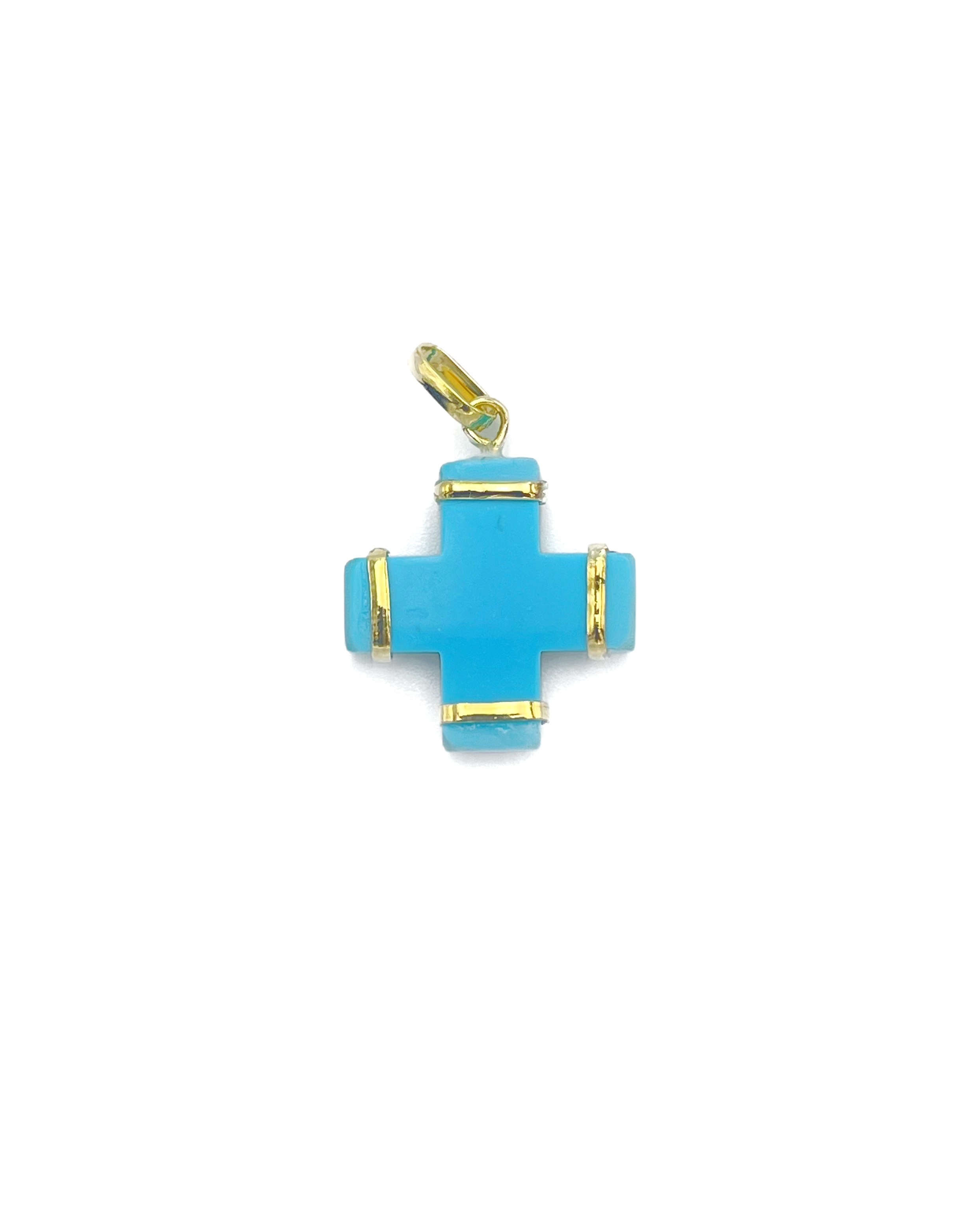 Σταυρός (συνθετική πέτρα χρώμα τυρκουάζ) με κρικακια,εξωτερική διάμετρος 18x18mm κατασκευάζεται σε Κίτρινο χρυσό και Κ9, Κ14, Κ18